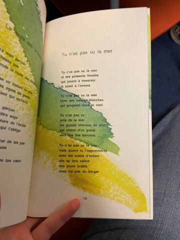 Nous avons ensuite parlé des albums jeunesse poétiques. Parmi nos nombreux coups de cœur découverts ce jour-là, citons « Les choses qui s’en vont » (de Béatrice Alemagna aux éditions Helium), un album rare où les images changent lorsque l'on tourne de douces pages de calques, ainsi que « Le ruban » (d’Adrien Parlange, éditions Albin Michel Jeunesse). Cet imagier aux illustrations vives a une particularité : un ruban unique que le lecteur manipule spontanément pour lui donner la forme attendue, est pris dans la reliure tel un signet, et vient compléter chaque image hors de la page.